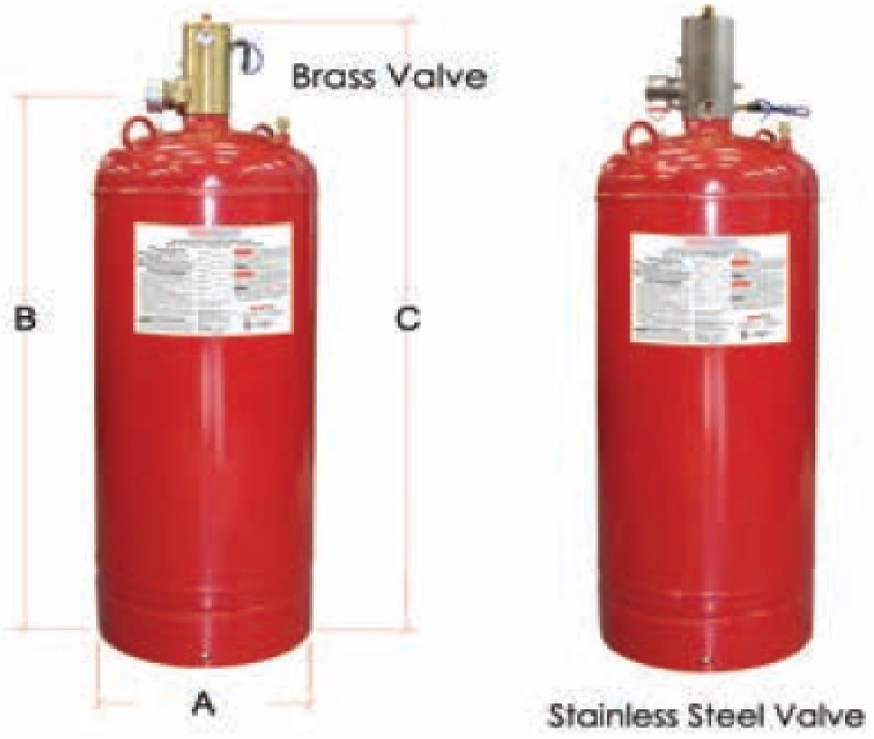 The Cleon Agent cylinders are manufactured and tested in accordance with DOT 4BW500 or DOT 4BA500. All cylinders are equipped with back pressure type volve. A piston in the volve bore is equipped with a rubber seal that keeps the FK-5-1-12 Clean Agent under pressure within the cylinder. A small hole in the piston allows cylinder pressure to be equalized onboth sides of the piston. Since the area at the top of the piston is greater thon the area at the bottom of the piston, the net force seals the piston against the valve discharge outlet. When the cylinder pressure on the top of the piston is relieved by means of automatic or manual activation, there is only cylinder pressure acting against the piston seal, and the piston slides to it’s full open position, allowing cylinder discharge through the distribution piping network.