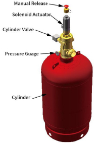 The automatic release of FG-200 (HFC-227ea) is controlled by a forged brass, differential pressure–operated cylinder valve connected to the cylinder neck. The valve assembly is supplied with an anti-recoil safety device installed at the discharge outlet and securely chained to the cylinder valve for safe handling.