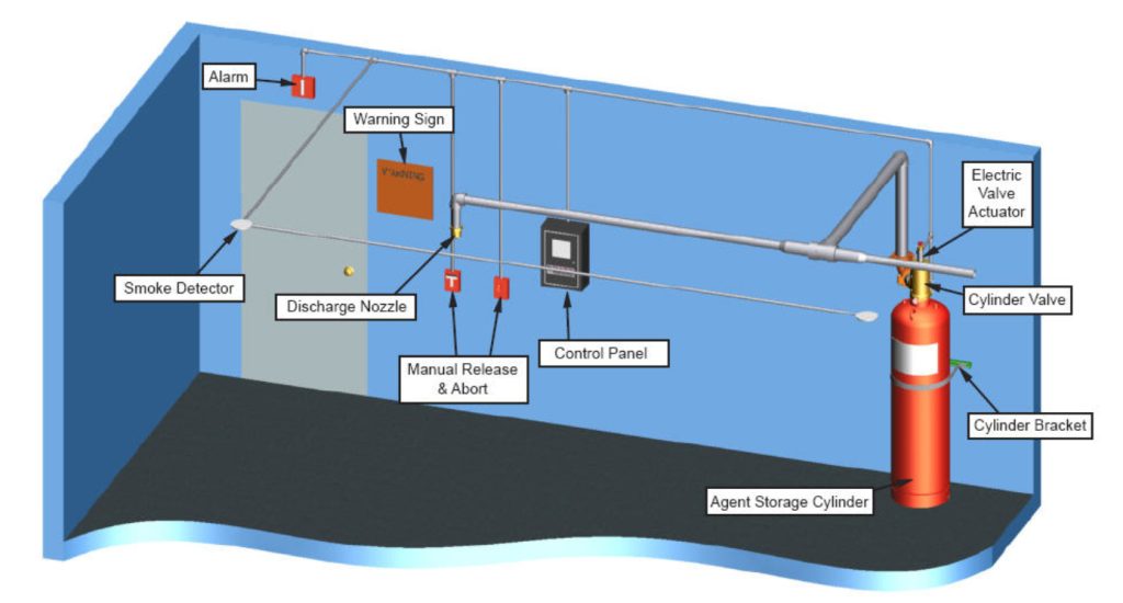Storage components consist of the cylinder assembly(s) containing the HFC-227ea clean agent, along with the cylinder bracket(s) that securely support and hold the cylinder assemblies in position.